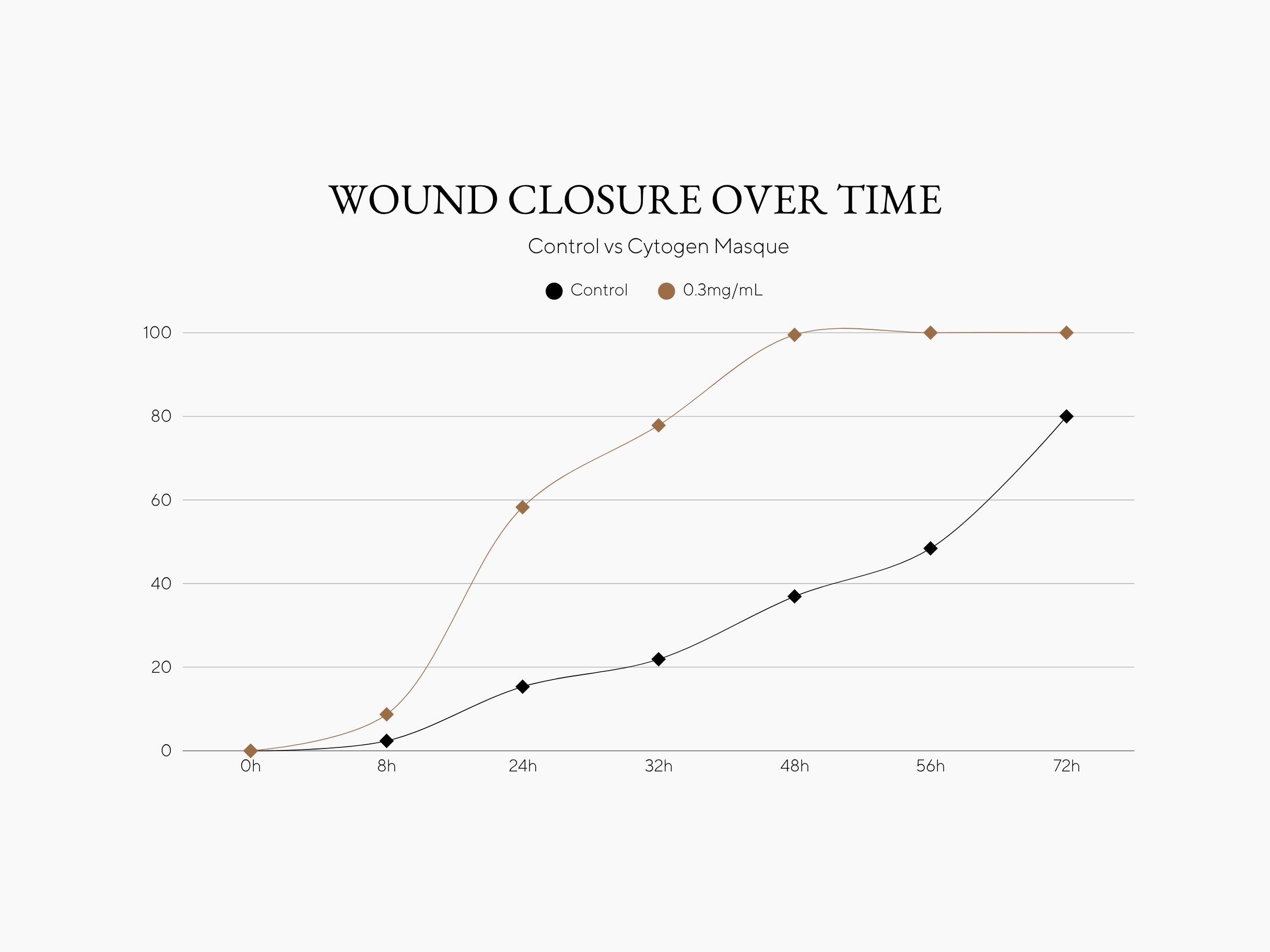 CYTOGEN Masque accelerated keratinocyte gap closure in a standard scratch assay, reaching near-complete closure as early as 32 hours at the lowest tested dose (0.3 mg/mL).